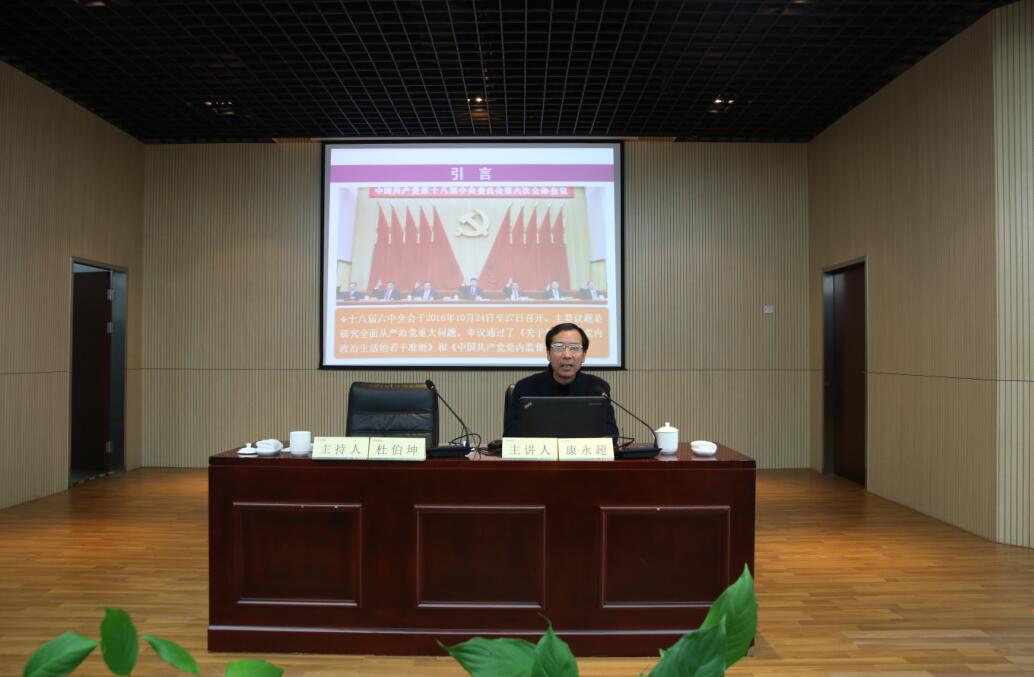 隨后,常州市委黨校理論研究中心主任康永超教授應(yīng)邀為全體黨員和領(lǐng)導(dǎo)干部作了《開(kāi)啟全面從嚴(yán)治黨新征程》的宣講,他通過(guò)對(duì)“六中全會(huì)的總體定位與鮮明特點(diǎn)”、“全會(huì)對(duì)習(xí)近平核心地位的明確”、“《準(zhǔn)則》和《條例》的基本要求”這三個(gè)問(wèn)題的解讀,幫助黨員和領(lǐng)導(dǎo)干部進(jìn)一步理解全面從嚴(yán)治黨的重要性和必要性,理解《關(guān)于新形勢(shì)下黨內(nèi)政治生活的若干準(zhǔn)則》和《中國(guó)共產(chǎn)黨黨內(nèi)監(jiān)督條例》的基本要求。