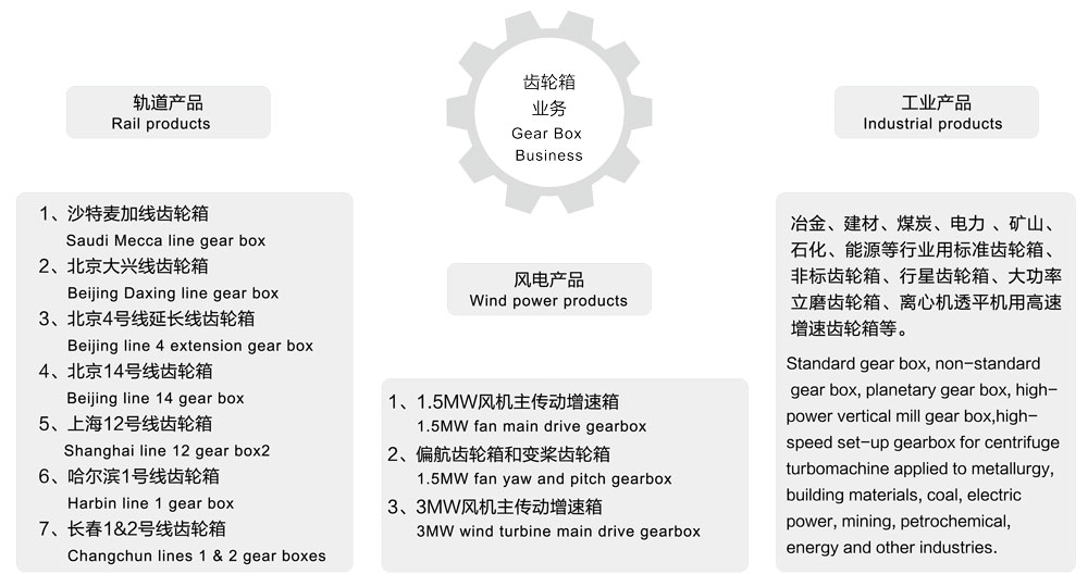 冶金、建材、煤炭、電力、礦山、石化、能源等行業(yè)用標(biāo)準(zhǔn)齒輪箱、非標(biāo)準(zhǔn)齒輪箱、行星齒輪箱、大功率立磨齒輪箱、離心機(jī)透平機(jī)用高速增速齒輪箱等。